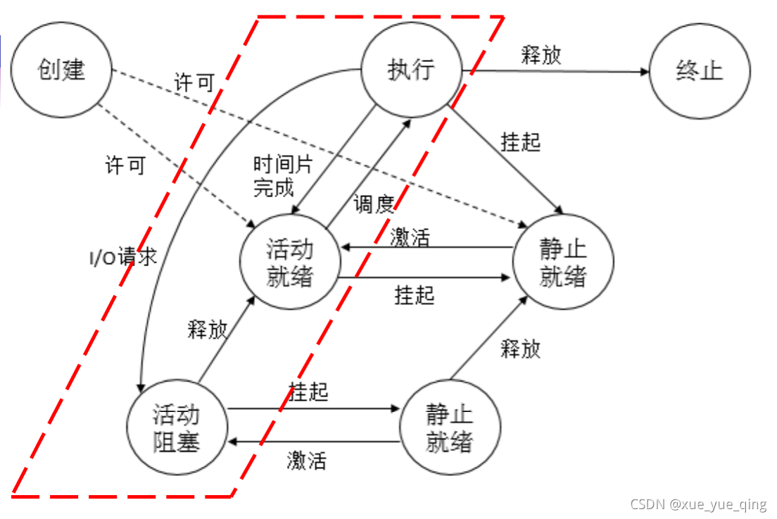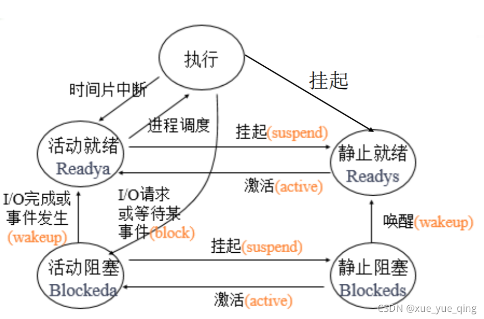 静止就绪→活动就绪(就绪状态):用相应的激活原语激活以后,重新进入活动就绪状态,进入就绪队列等待调度