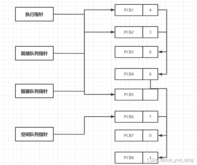 - 相同状态的进程PCB组成一个队列,不同状态对应多个不同的队列。
