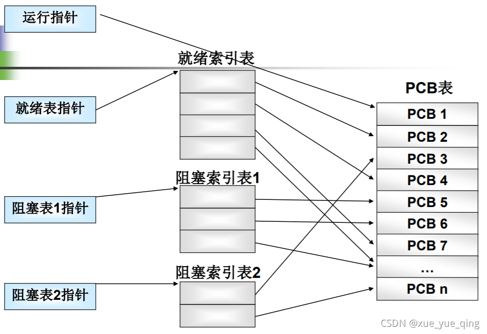 对具有相同状态的进程,分别设置各自的PCB索引表, 存放这些进程PCB在PCB表中的地址。