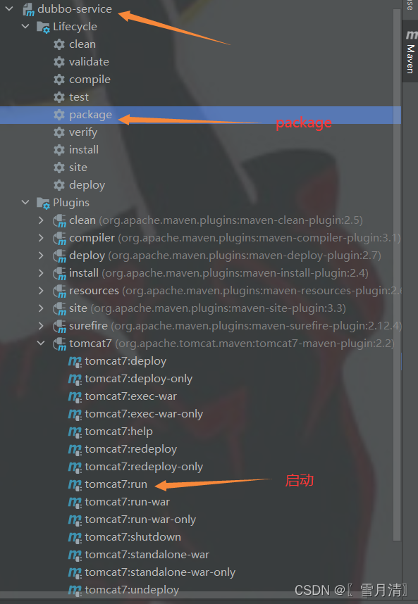 在IDEA右侧maven管理中对dubbo-service模块进行package然后选择tomcat7:run插件进行启动
