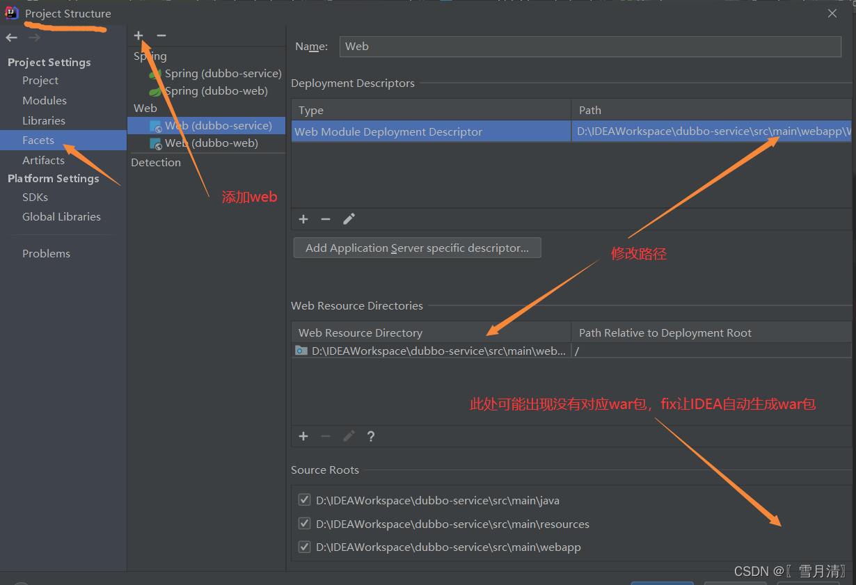 3.将dubbo-web中的webapp放到dubbo-service中,需要在文件结构project structure中faces中给dubbo-service添加web服务,并修改路径到 包结构+\dubb-web\src\main\webapp\WEB-INF\web.xml