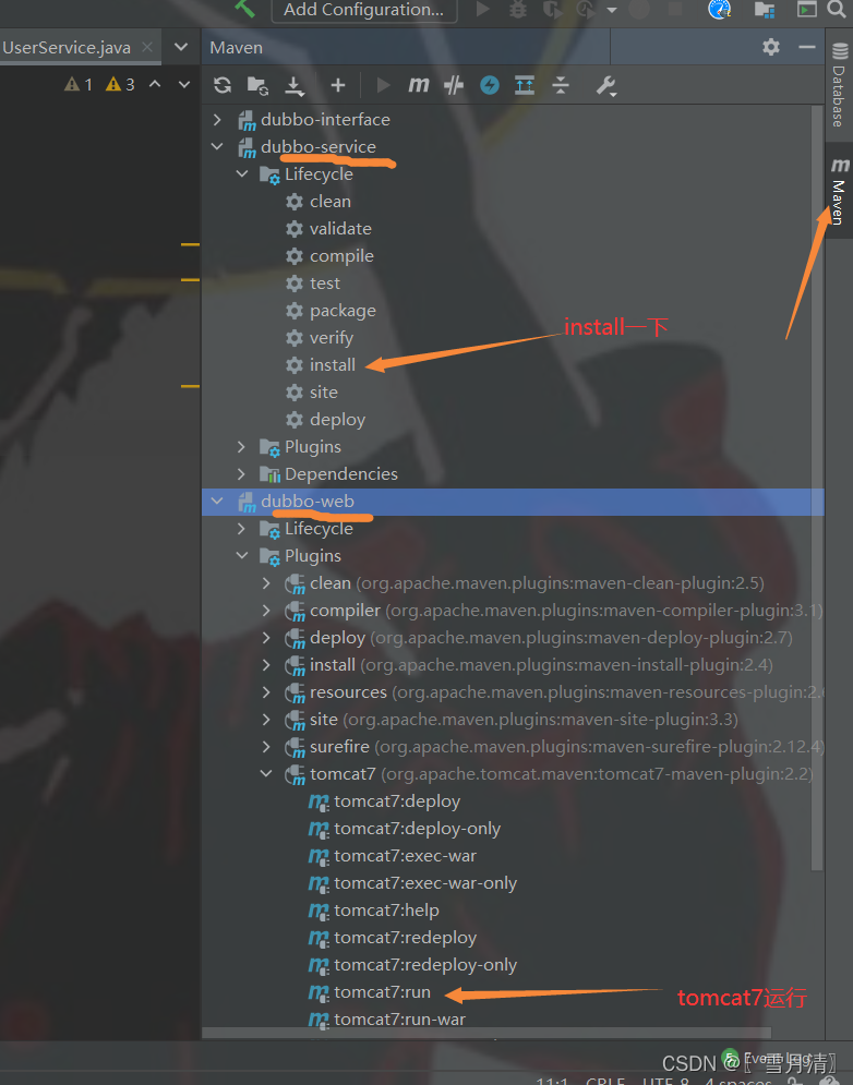 maven管理中install一下dubbo-service模块,然后在dubbo-web的maven管理中选择tomcat7:run插件进行启动