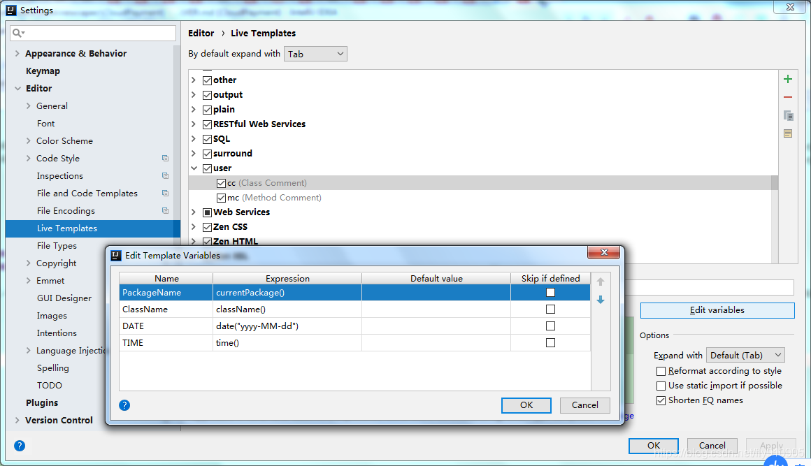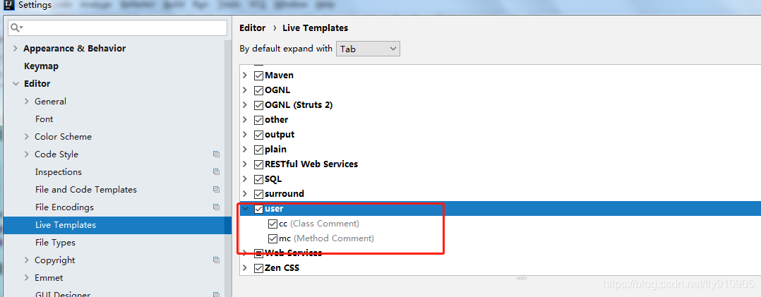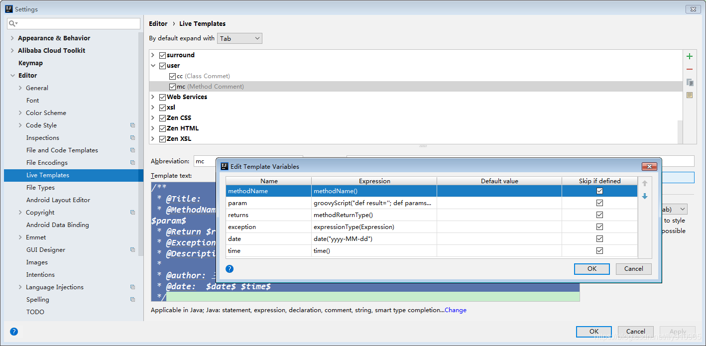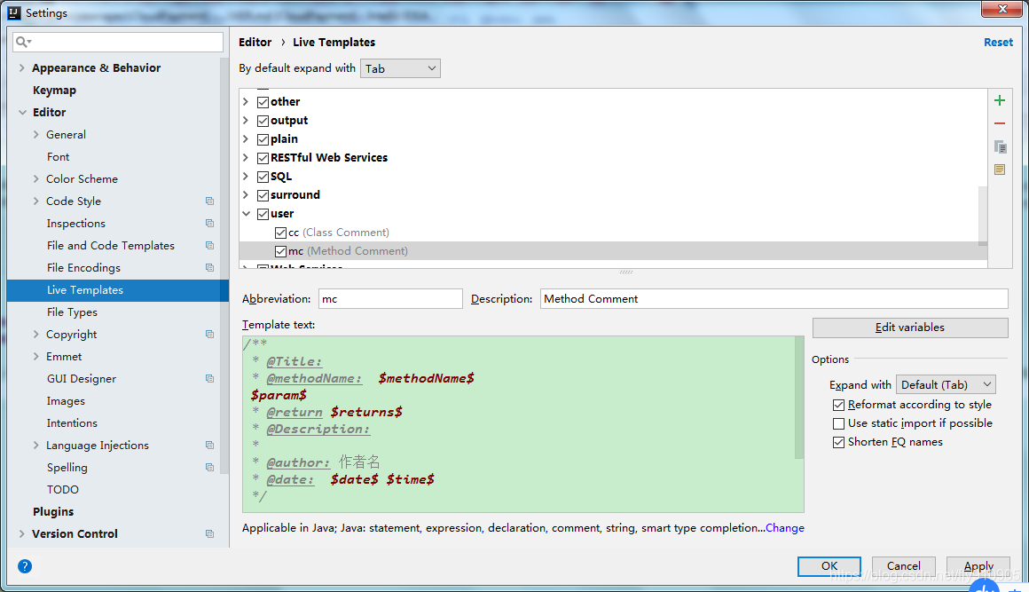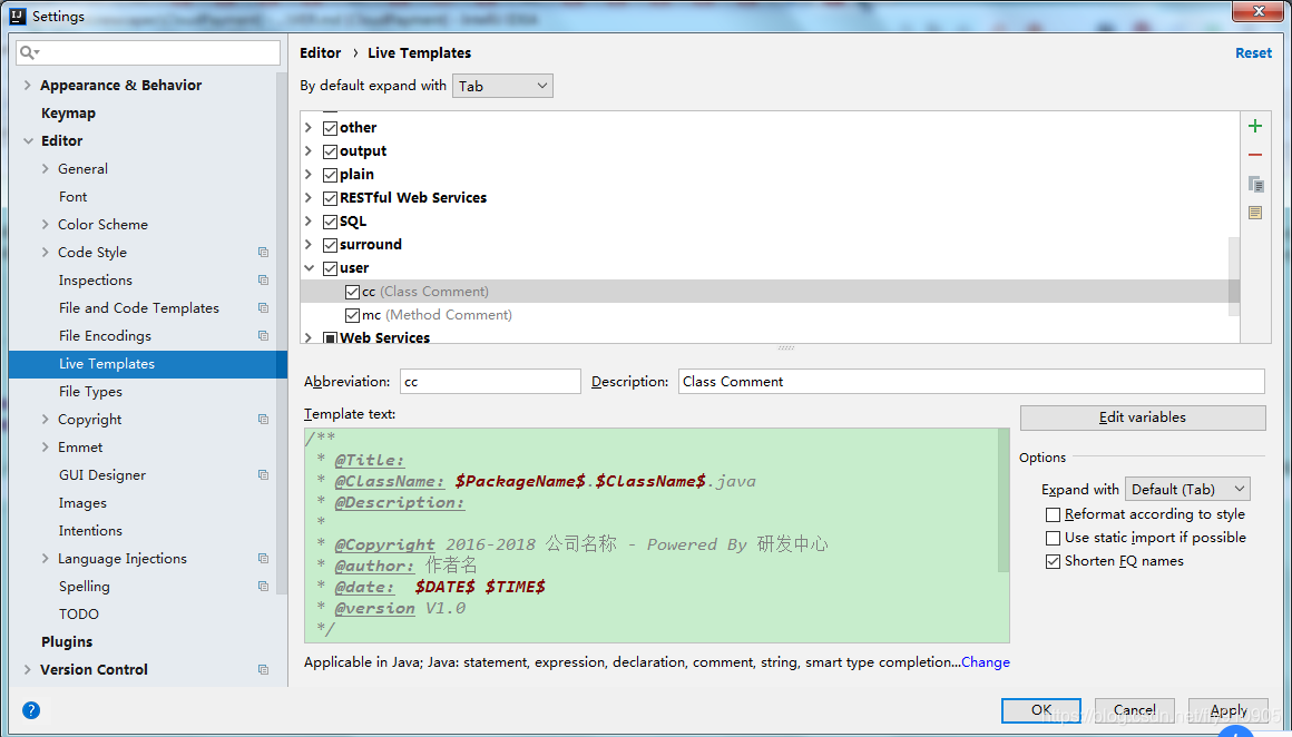 选中刚才新建的user,再次点击绿色+号,选择Live Template,起个名,比如cc(类注释),mc(方法注释)