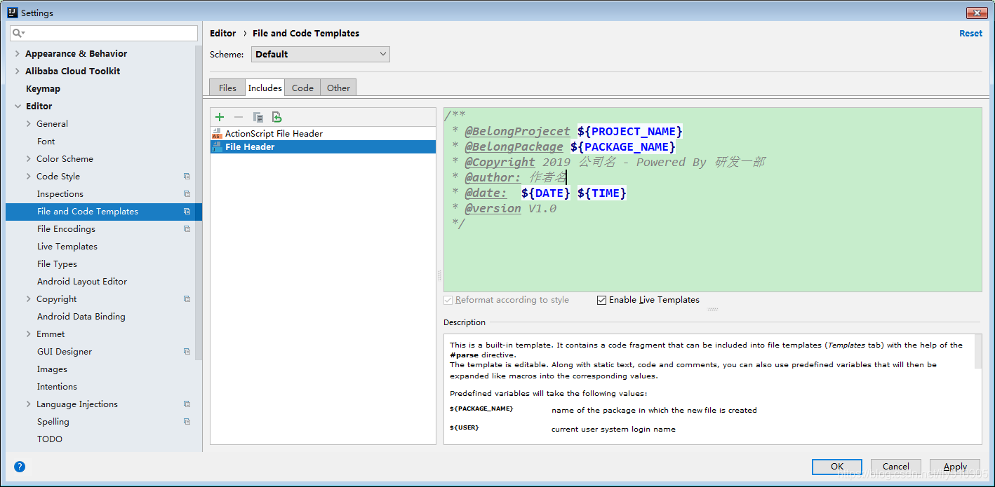 第二步、Editor -> File and Code Templates -> Includes -> File Header