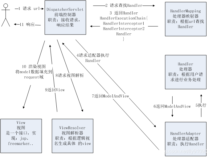 3、处理器映射器根据请求url找到具体的处理器,生成处理器对象及处理器拦截器(如果有则生成)一并返回给DispatcherServlet。
