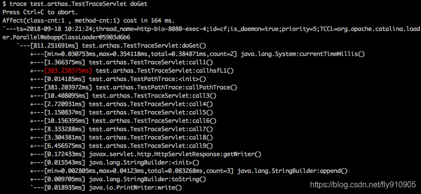 PS: 很多时候我们只想看到某个方法的rt大于某个时间之后的trace结果,例如trace *StringUtils isBlank '$cost>100'表示当执行时间超过100ms的时候,才会输出trace的结果。