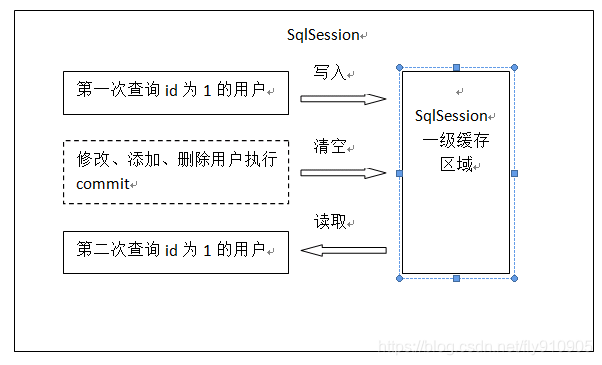 同一个sqlsession再次发出相同的sql,就从缓存中取,不走数据库。如果两次中间出现commit操作(修改、添加、删除),本sqlsession中的一级缓存区域全部清空,下次再去缓存中查询不到,所以要从数据库查询,从数据库查询到再写入缓存。