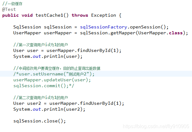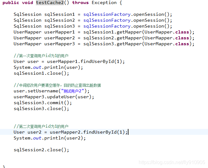 开启两个SqlSession,在sqlSession1中查询数据,使一级缓存生效,在sqlSession2中更新数据库,验证一级缓存只在数据库会话内部共享。