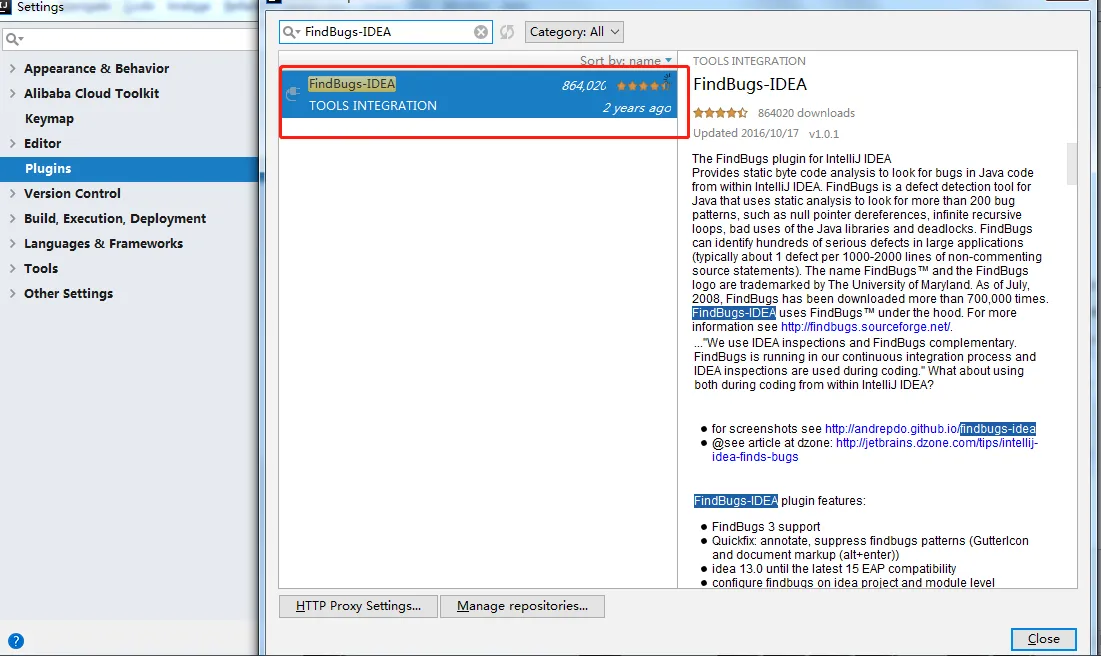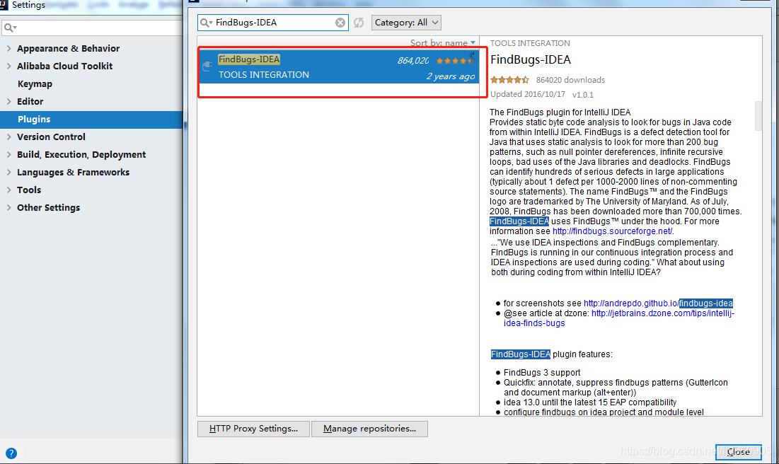 在IDEA的设置(Settings)中搜索FindBugs-IDEA