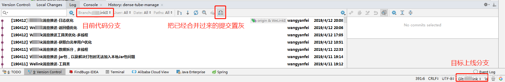 - 点选最后一个按钮,可以把已经合并过来的提交置灰。这一步可选