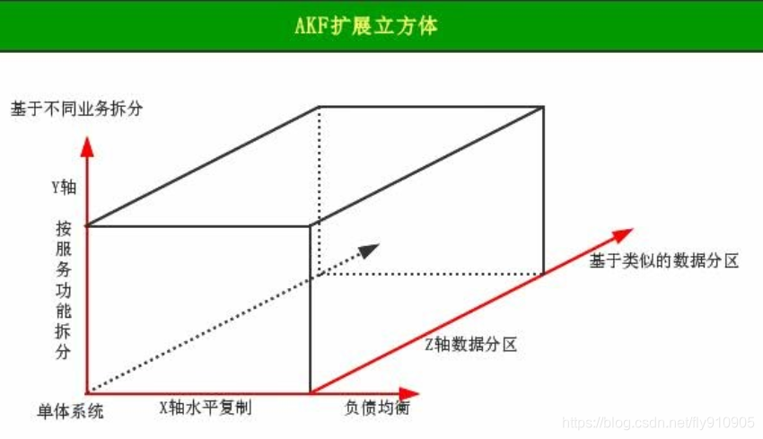 AKF扩展立方体,是一个AKF公司的技术专家抽象总结的应用扩展的三个维度,理论上按照这三个扩展模式,可以将一个单体系统进行无限扩展。