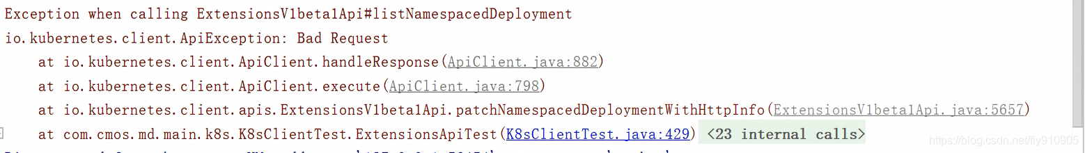 @Test public void ExtensionsApiTest(){ ExtensionsV1beta1Api apiInstance = new ExtensionsV1beta1Api(); String jsonPatchStr = "{\"op\":\"replace\",\"path\":\"/spec/replicas\", \"value\": " + 2 + " }"; V1Patch patch = new V1Patch(jsonPatchStr); try { ApiResponse<ExtensionsV1beta1Scale> apiResponse = apiInstance. patchNamespacedDeploymentScaleWithHttpInfo("资源名称", "分区名称", patch, "false", null, null, null); } catch (ApiException e) { e.printStackTrace(); } }