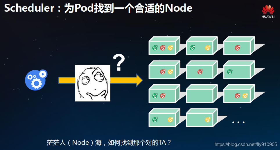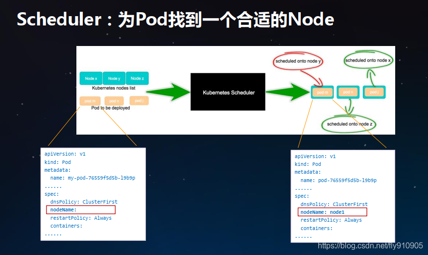 - Scheduler同样通过apiserver的watch接口更新到pod可以被调度,通过算法给pod分配节点,并将pod和对应节点绑定的信息交给apiserver,apiserver写到etcd,然后将pod交给kubelet。