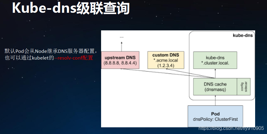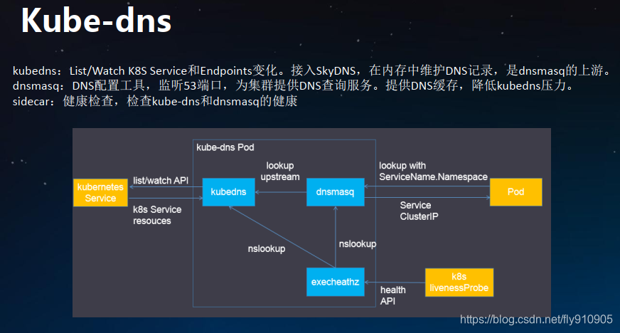 - kubedns: List/Watch K8S Service和Endpoints变化。接入SkyDNS,在内存中维护DNS记录,是dnsmasq的上游。