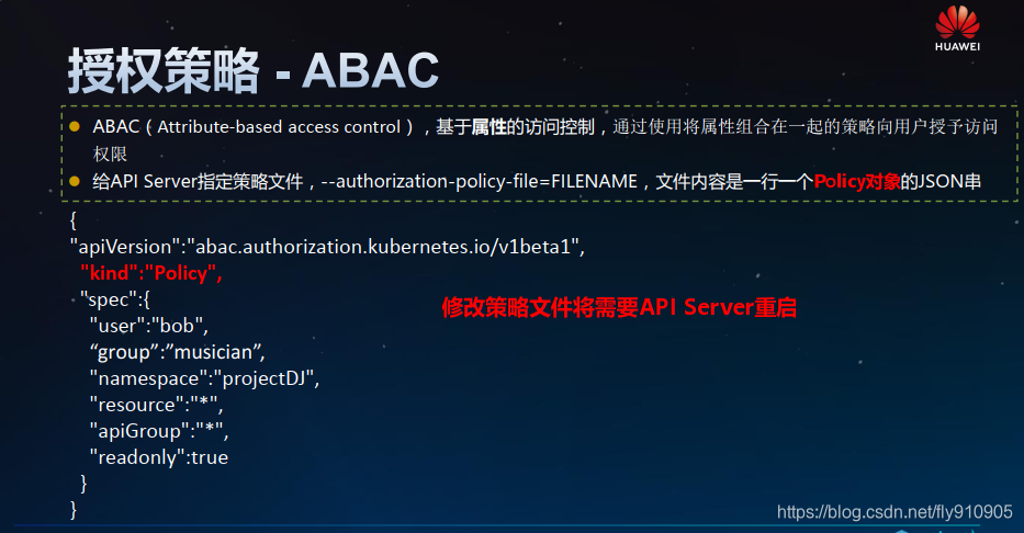 | Kubelet可以读写事件 | {"apiVersion": "abac.authorization.kubernetes.io/v1beta1", "kind": "Policy", "spec": {"user": "kubelet", "namespace": "*", "resource": "events"}} |