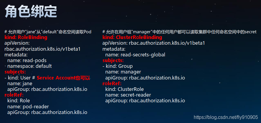 - * 角色绑定包含了一组相关主体(即subject, 包括用户、用户组、或者Service Account)以及对被授予角色的引用