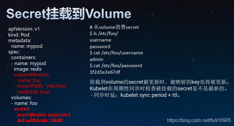 - - 作为 volume 中的文件被挂载到 pod 中的一个或者多个容器里
