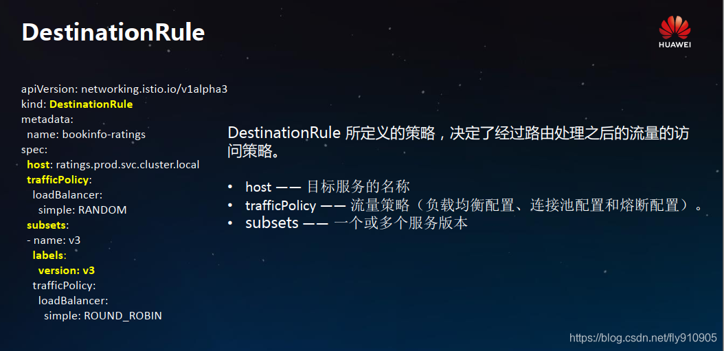 - DestinationRule 是 VirtualService 路由生效后,配置应用与请求的策略集。
