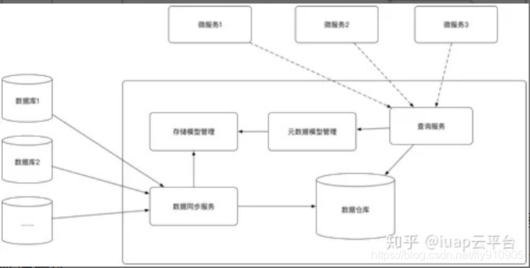此方案的实现主要是组合了PaaS以下几个能力形成的:存储模型管理,元数据模型管理,统一的数据仓库,数据同步服务,数据查询服务。