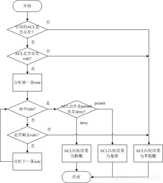从整个ACL匹配流程可以看出,报文与ACL规则匹配后,会产生两种匹配结果:“匹配”和“不匹配”。