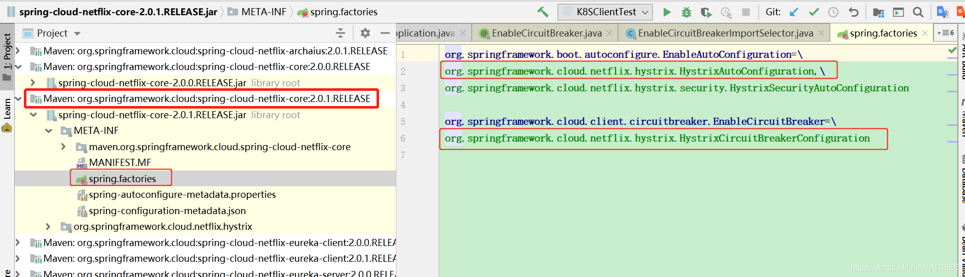 其实EnableCircuitBreakerImportSelector的作用就是去导入熔断器的配置 。其实Spring中也有类似于JAVA SPI 的加载机制, 即会自动加载 jar包 spring-cloud-netflix-core 中的META-INF/spring.factories 中的Hystrix相关的自动配置类
