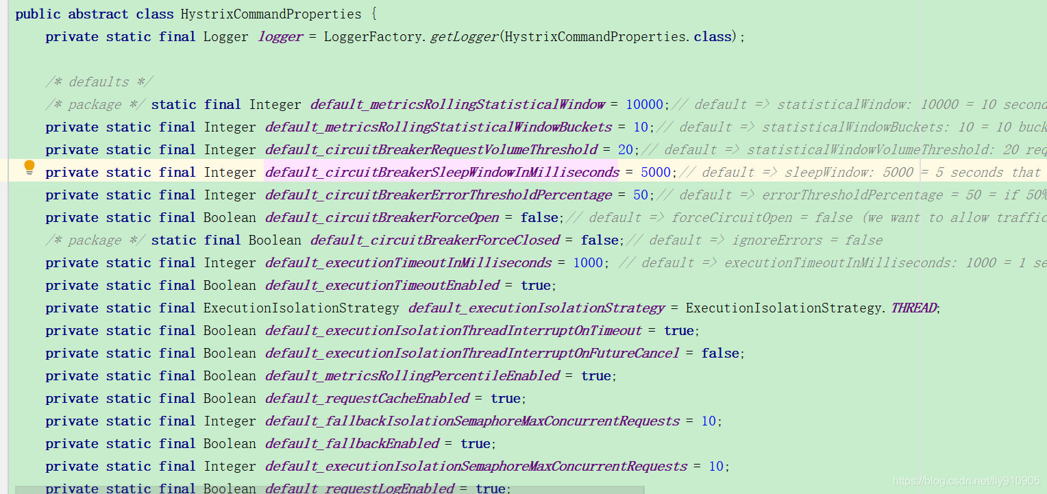 这个和熔断器自动恢复有关,为了检测后端服务是否恢复,可以放一个请求过去试探一下。sleepWindow指的发生熔断后,必须隔sleepWindow这么长的时间,才能放请求过去试探下服务是否恢复。默认是5s