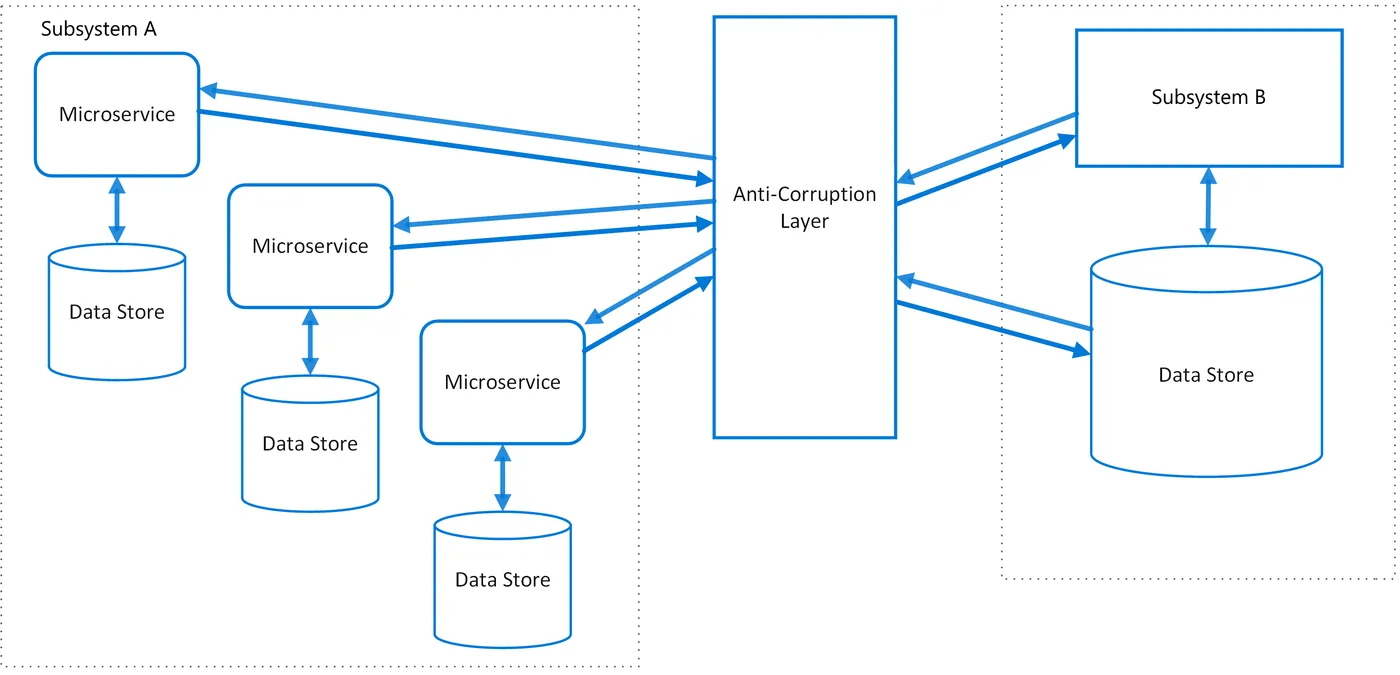 - 反腐层(Anti-corruption layer)介于新应用和遗留应用之间,用于确保新应用的设计不受遗留应用的限制。