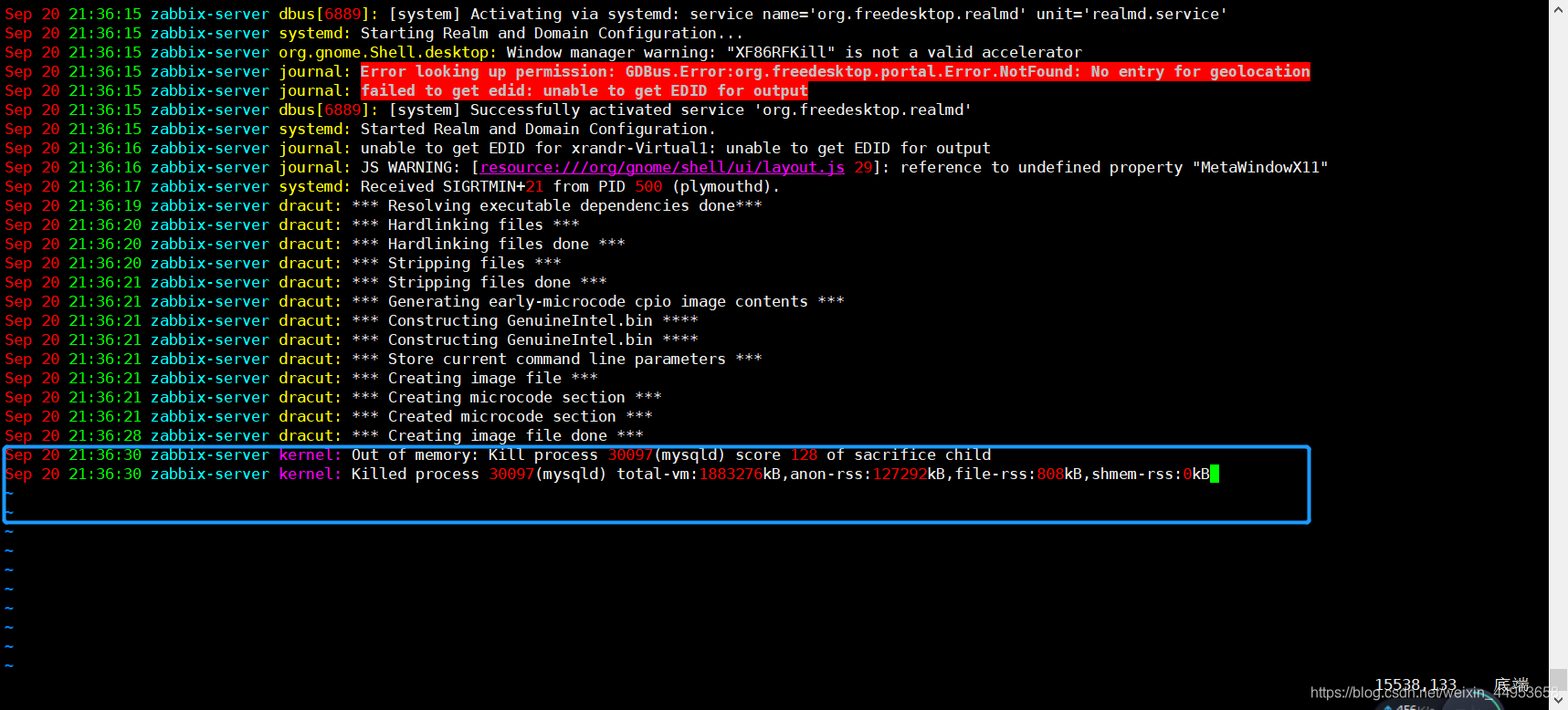 3.打开/var/log/message日志即可看到oom,将mysqlkill掉了