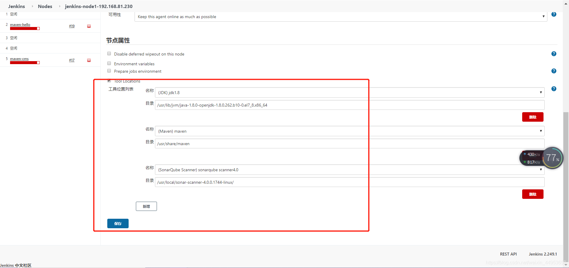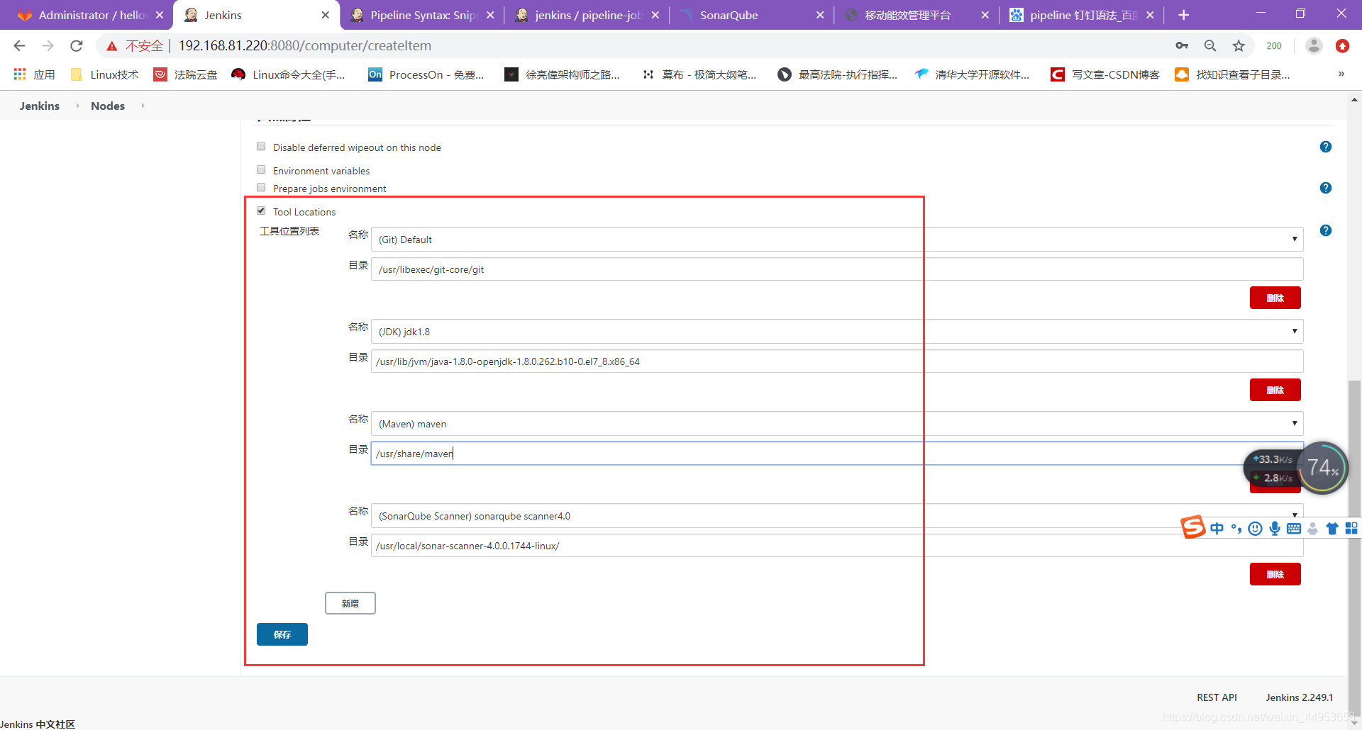 此步骤配置主要是为了master与slave上的环境保持一致 在slave1上安装依赖软件 [root@jenkins-node1 ~]# yum -y install git java maven curl-devel expat-devel gettext-devel openssl-devel zlib-devel [root@jenkins-node1 ~]# scp root@192.168.81.220:/usr/local/sonar-scanner-4.0.0.1744-linux/ /usr/local/ 查看git安装位置 [root@jenkins-node1 ~]# rpm -ql git | less /usr/libexec/git-core/git 查看jdk、maven路径 [root@jenkins-node1 ~]# mvn --version Apache Maven 3.0.5 (Red Hat 3.0.5-17) Maven home: /usr/share/maven #maven路径 Java version: 1.8.0_262, vendor: Oracle Corporation Java home: /usr/lib/jvm/java-1.8.0-openjdk-1.8.0.262.b10-0.el7_8.x86_64/jre #jdk路径 Default locale: zh_CN, platform encoding: UTF-8 OS name: "linux", version: "3.10.0-957.el7.x86_64", arch: "amd64", family: "unix" 将脚本目录拷贝至slave1 [root@jenkins-node1 ~]# scp -r root@192.168.81.220:/script /