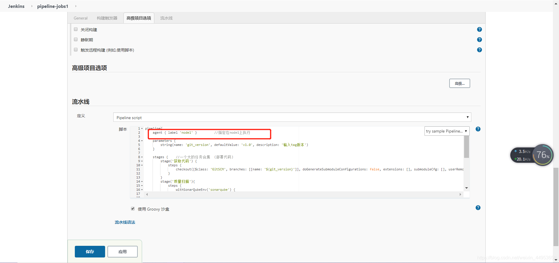 4.配置pipeline项目指定在slvae1上运行
