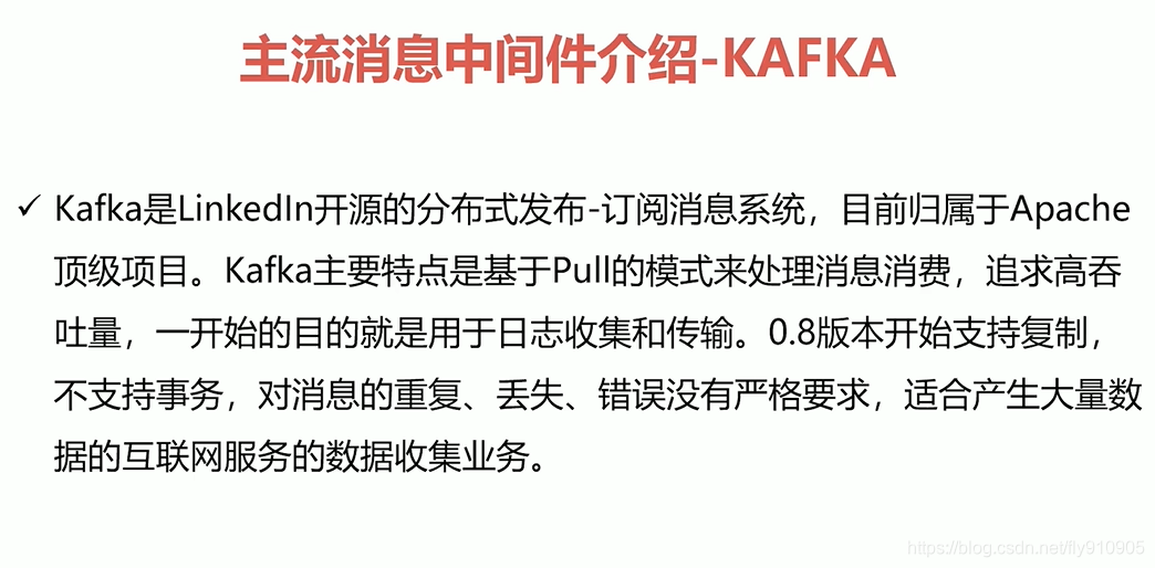 0.8版本开始支持复制,不支持事务,对消息的重复、丢失、错误没有严格要求,适合产生大量数据的互联网服务的数据收集业务。这里可以看出kafka只关注吞吐量。