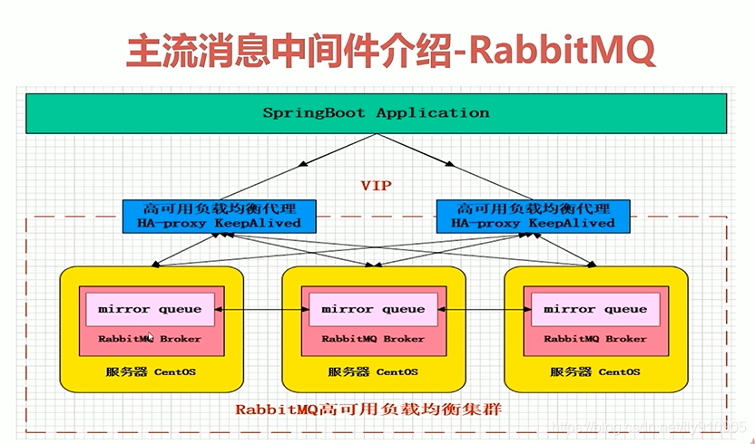 - 图中说的就是,我们可以采用三个节点作为RabbitMQ的一组集群,当然可以有许多组。节点与节点之间采用mirror queue。基于这种方式,能够保证数据百分之百的不丢失。