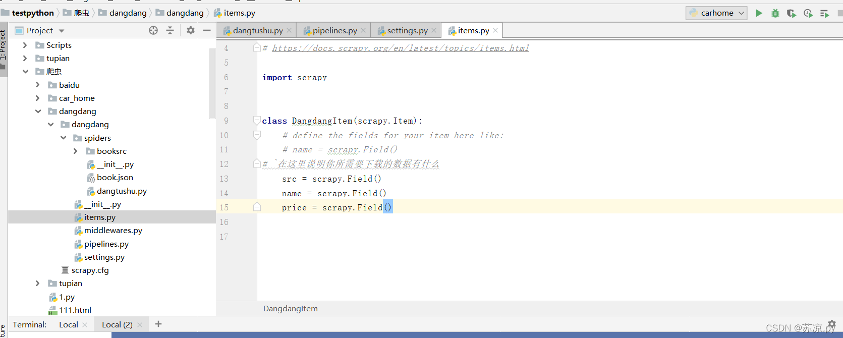 book =DangdangItem(src = src , name =name ,price = price) # 将book的值传给pipelines yield book