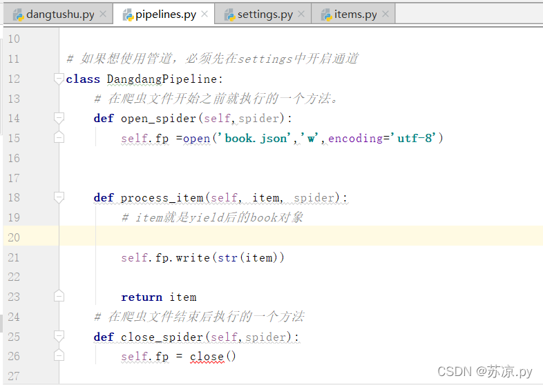 def open_spider(self,spider): self.fp =open('book.json','w',encoding='utf-8')