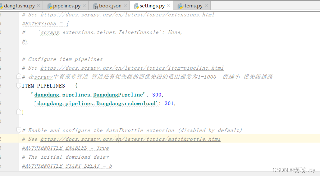 在我们使管道下载数据之前,需要在settings.py文件中手动打开管道(将其注释打开)。