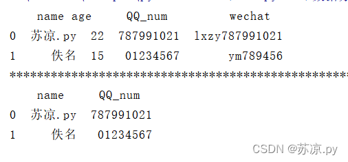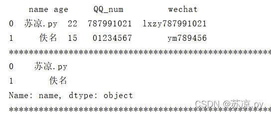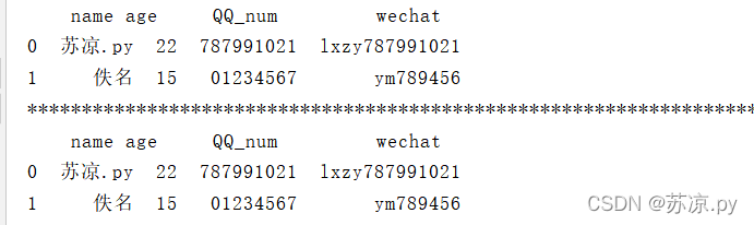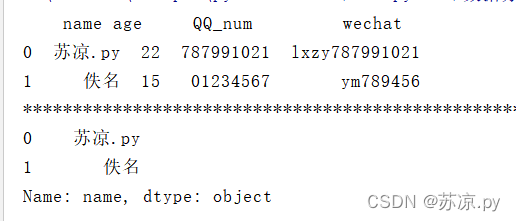 import pandas as pd list = { 'name':['苏凉.py','佚名'], 'age':['22','15'], 'QQ_num':['787991021','01234567'], 'wechat':['lxzy787991021','ym789456'] } person = pd.DataFrame(list) print(person)