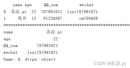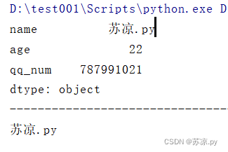 import pandas as pd dic = { 'name':'苏凉.py', 'age':'22', 'qq_num':'787991021', } information = pd.Series(dic) print(information) print('-'*100) print(information[0])