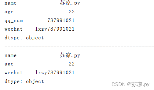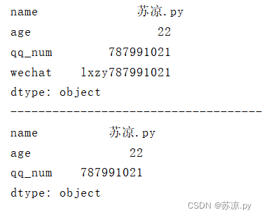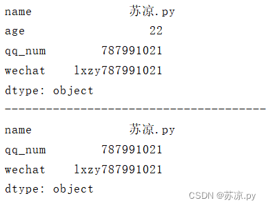 import pandas as pd dic = { 'name':'苏凉.py', 'age':'22', 'qq_num':'787991021', } information = pd.Series(dic) print(information)