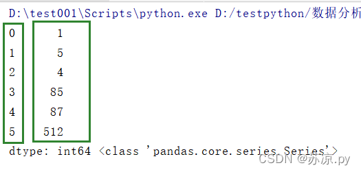import pandas as pd a = pd.Series([1,5,4,85,87,512]) print(a,type(a))