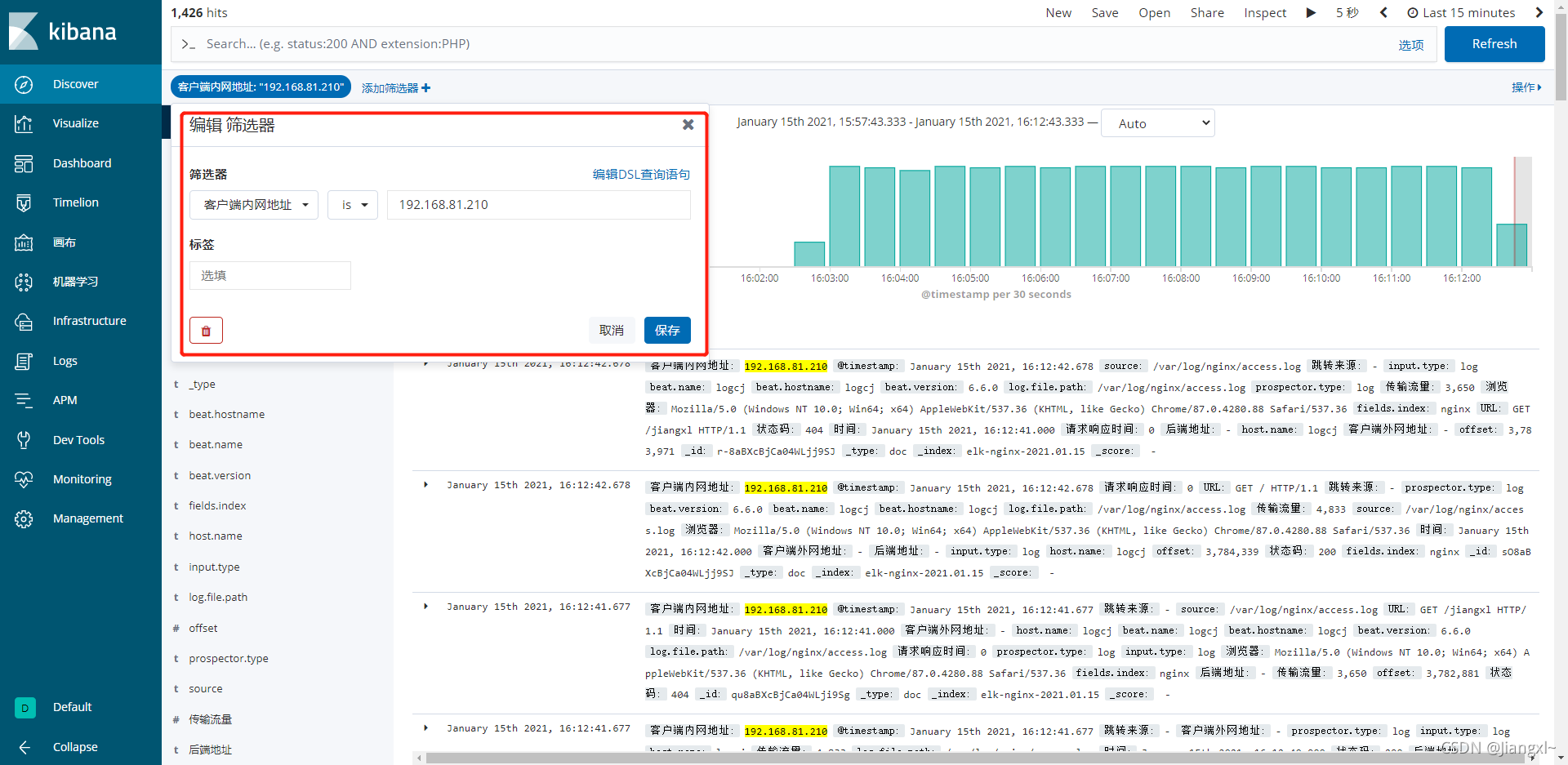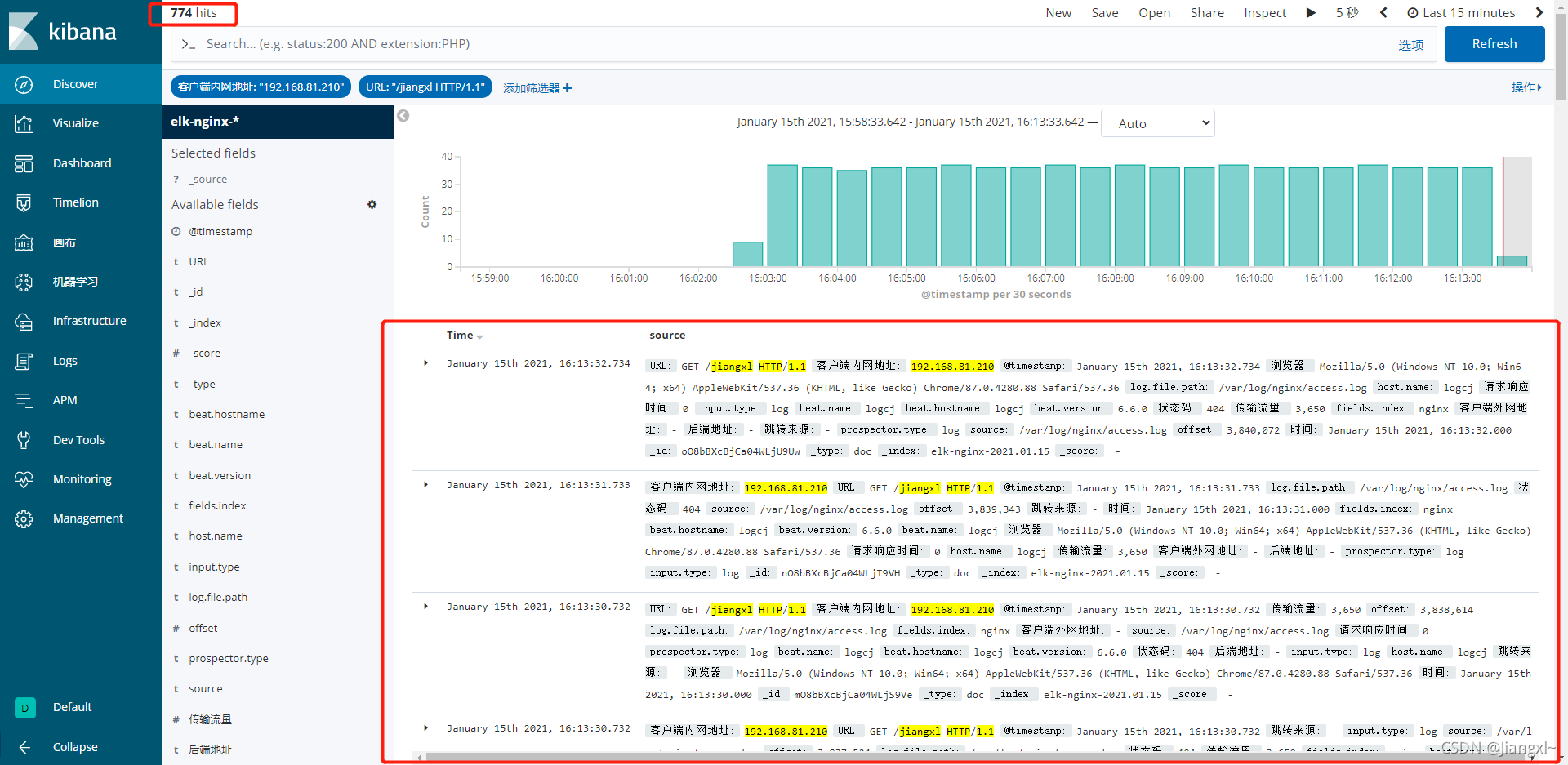 由于nginx普通日志收集过来的日志内容都是存在一个字段中的值,我们想单独对日志中的某一项进行查询统计,比如我只想查看某个IP请求了我那些页面,一共访问了多少次,在普通的日志中是无法过滤的,不是很满意