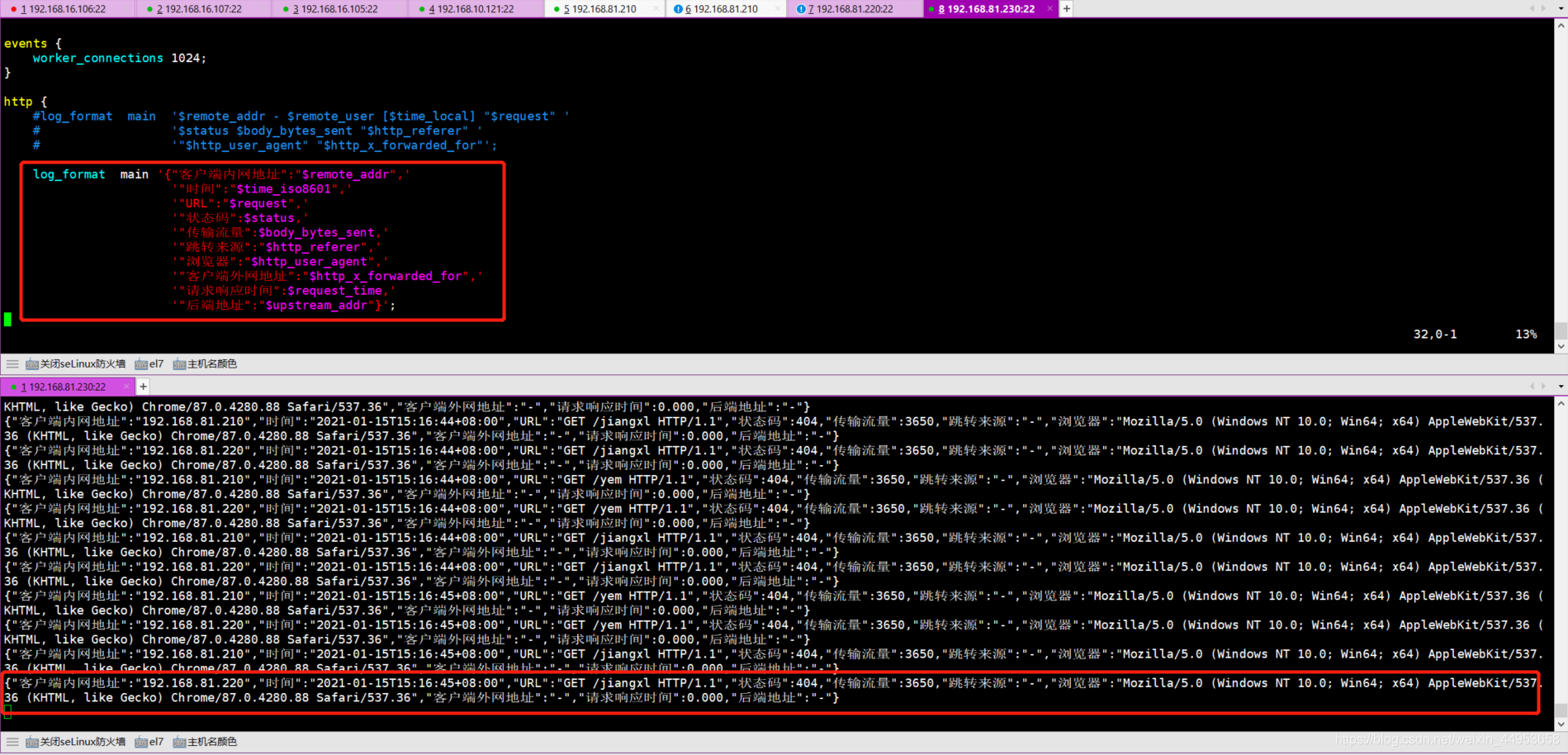 1.修改主配置文件 [root@logsj ~]# vim /etc/nginx/nginx.conf http { log_format main '{"客户端内网地址":"$remote_addr",' '"时间":"$time_iso8601",' '"URL":"$request",' '"状态码":$status,' '"传输流量":$body_bytes_sent,' '"跳转来源":"$http_referer",' '"浏览器":"$http_user_agent",' '"客户端外网地址":"$http_x_forwarded_for",' '"请求响应时间":$request_time,' '"后端地址":"$upstream_addr"}'; } 2.重启 [root@logsj ~]# nginx -t [root@logsj ~]# systemctl reload nginx