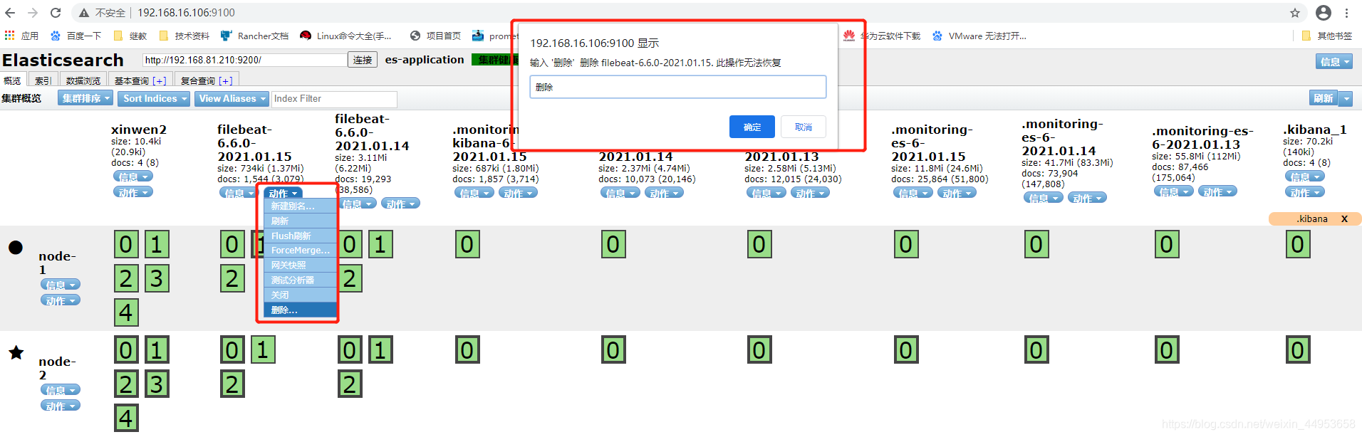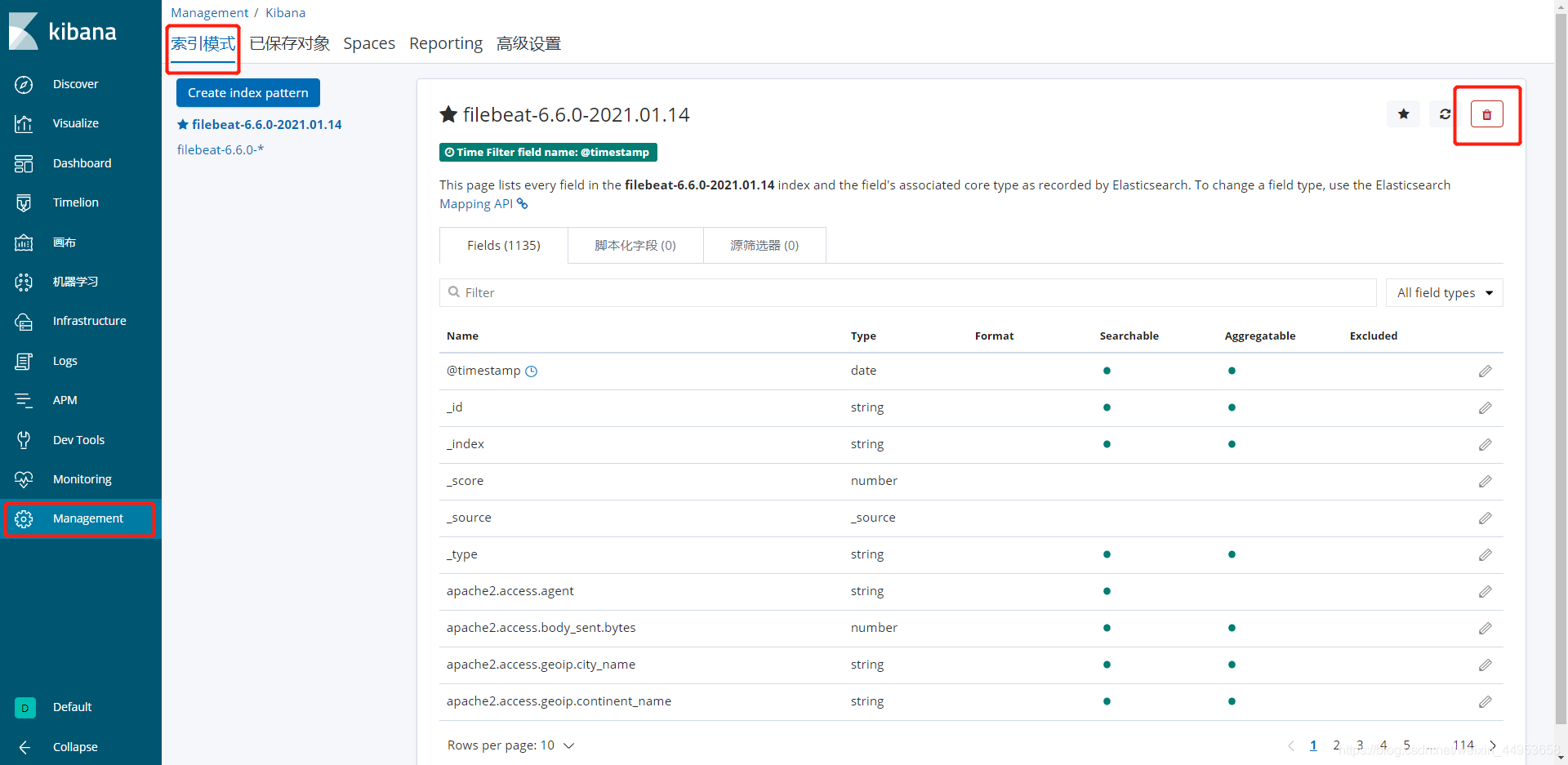 kibana上对应es的日志索引库也需要删除,否则新日志进来后,由于是json格式,很多字段会提示感叹号