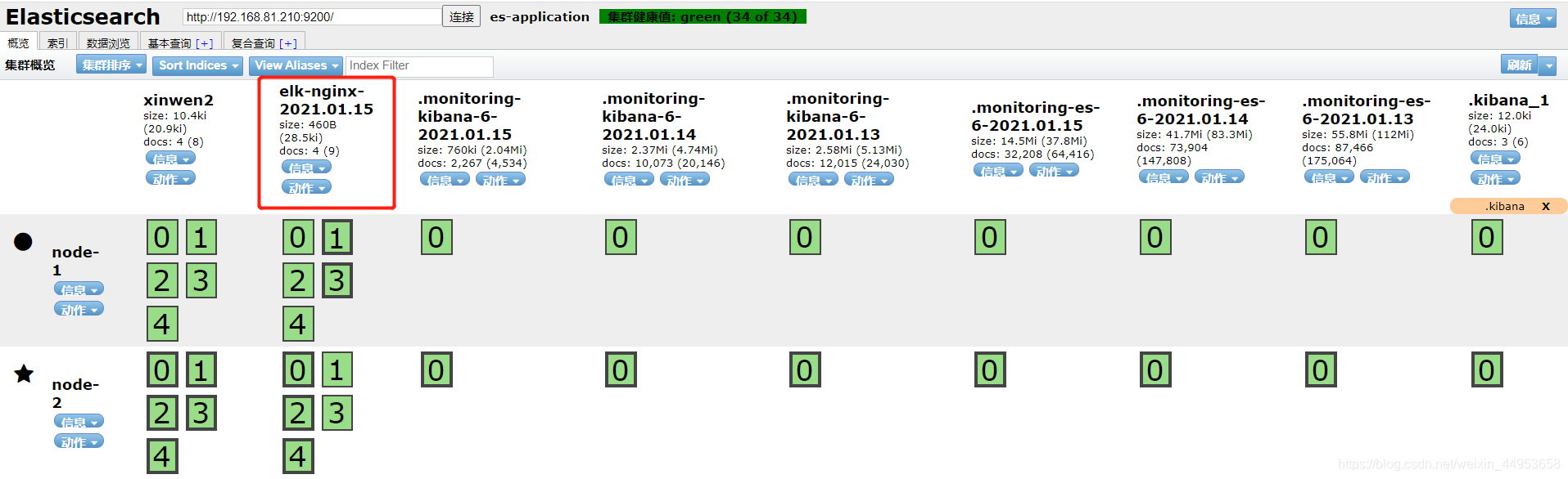 1.修改配置文件 [root@logsj ~]# vim /etc/filebeat/filebeat.yml filebeat.inputs: - type: log enabled: true paths: - /var/log/nginx/access.log - /var/log/nginx/error.log fields: #类似于标签 index: nginx json.keys_under_root: true json.overwrite_keys: true output.elasticsearch: hosts: ["192.168.81.210:9200"] indices: #定义索引名 - index: "elk-nginx-%{+yyyy.MM.dd}" when.equals: #与那个标签关联 fields: index: "nginx" 2.重启 [root@logsj ~]# systemctl restart filebeat