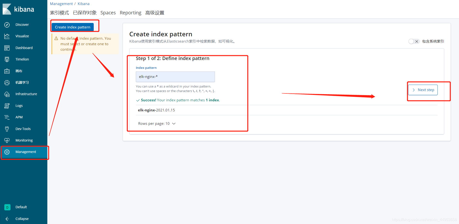 点击Managerment—创建索引—索引名称使用通配符形式,与es上的索引进行关联