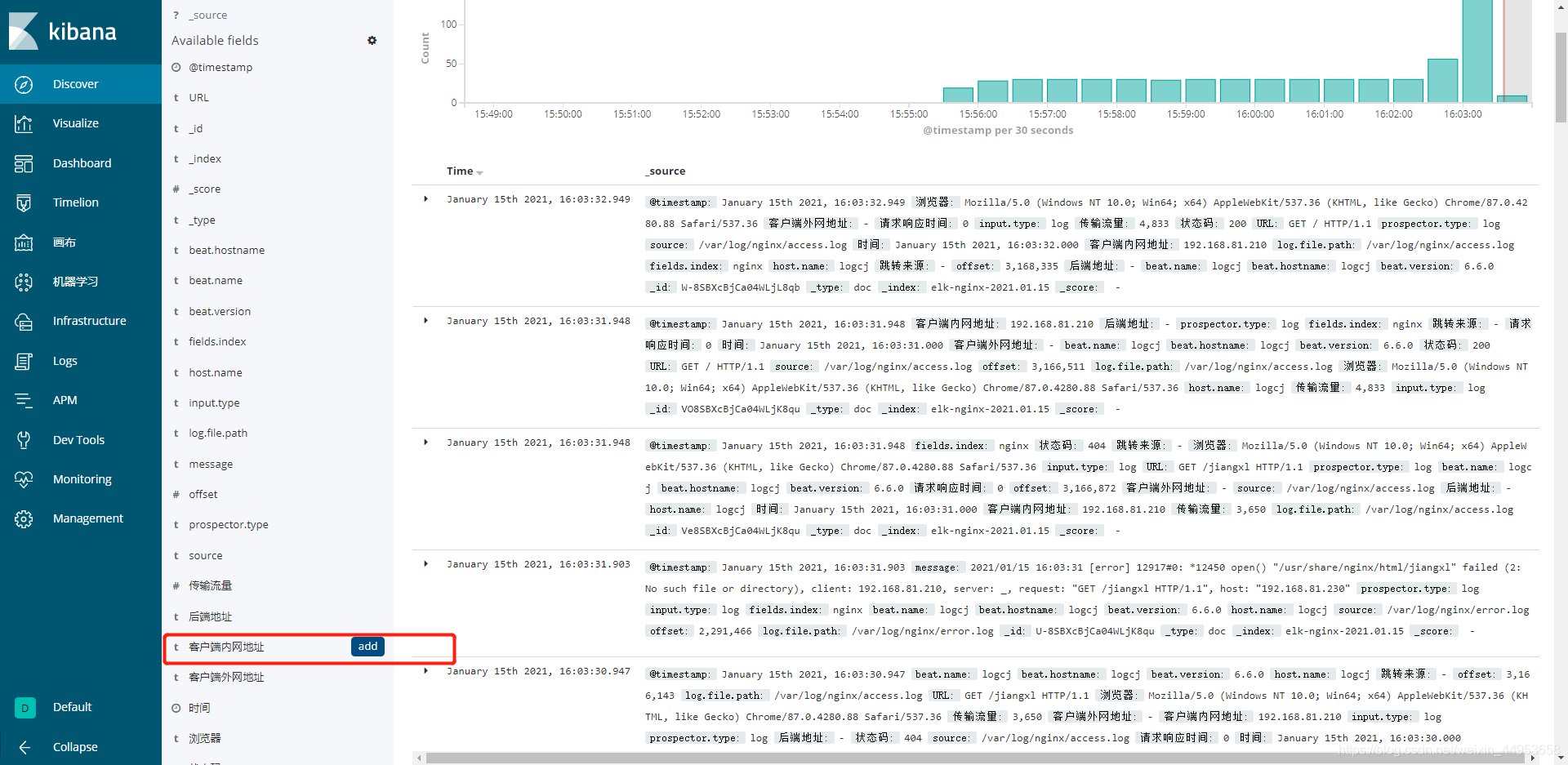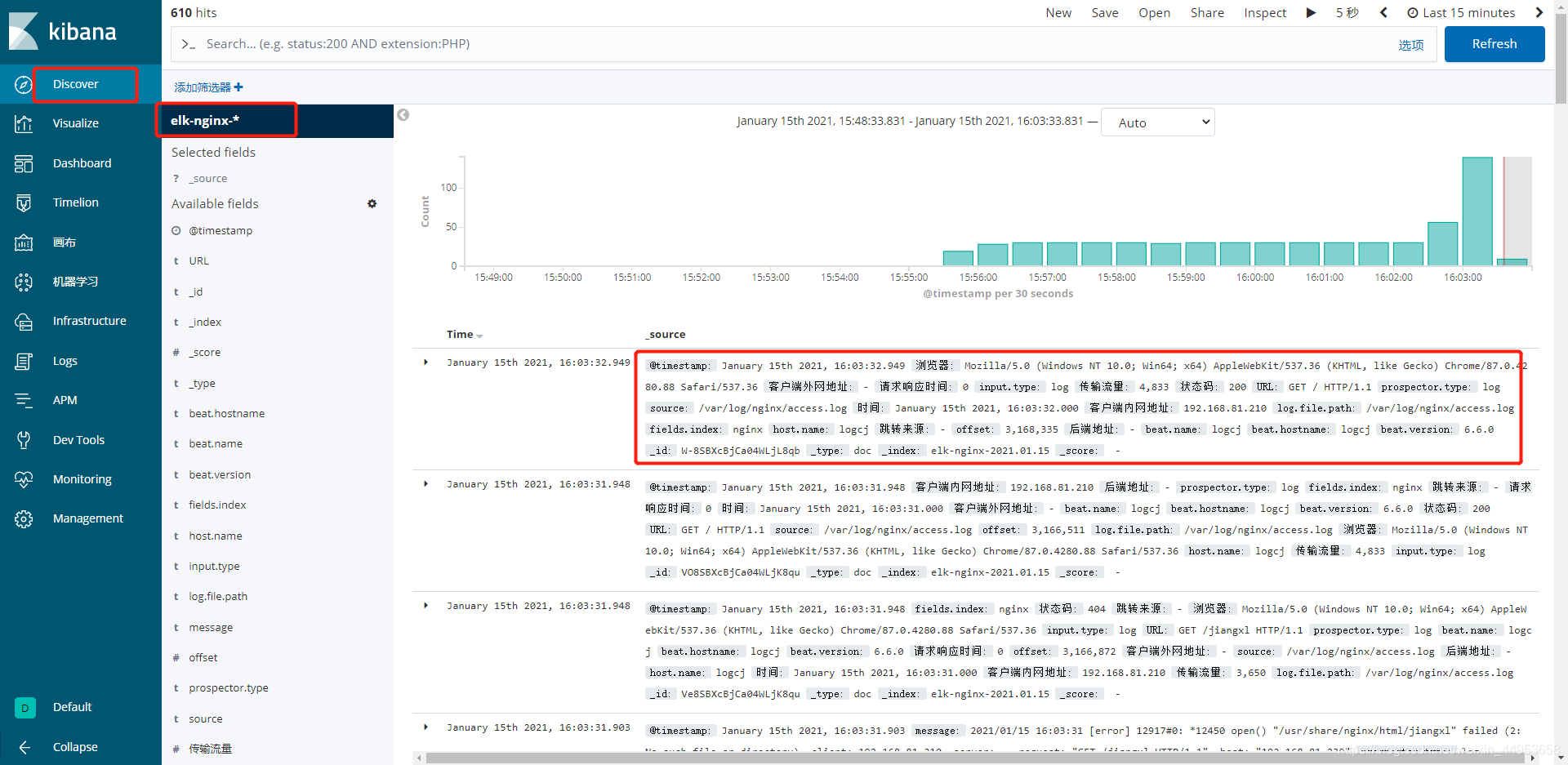 一定要清空es之前收集的传统日志格式的数据,还要把nginx日志情况,如果有多台nginx服务器,则改完json格式的日志后,一定要把日志清空,否则将会在kibana中显示两种日志格式