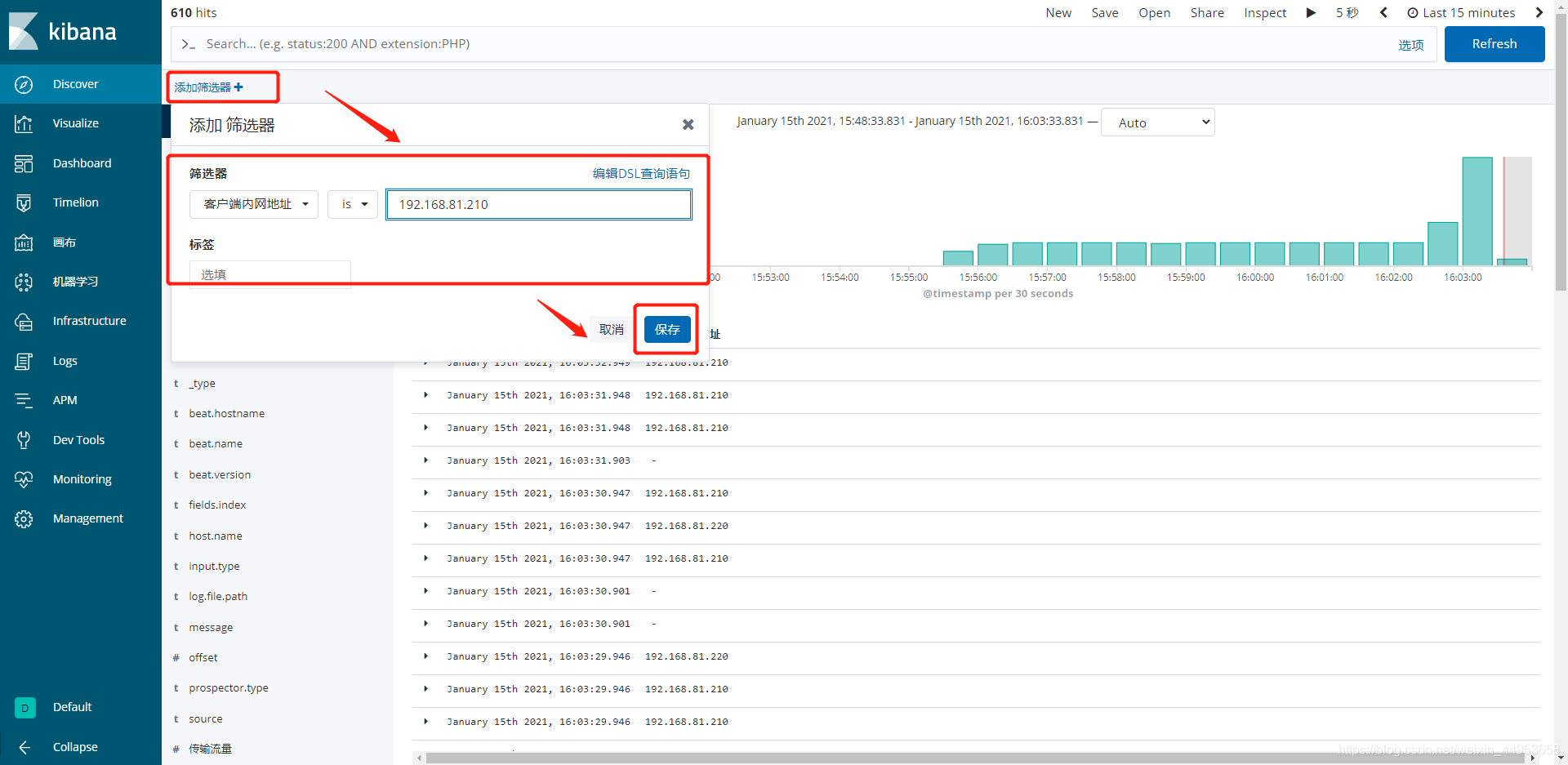 筛选的时候选择客户端内网地址字段,在写上匹配的值