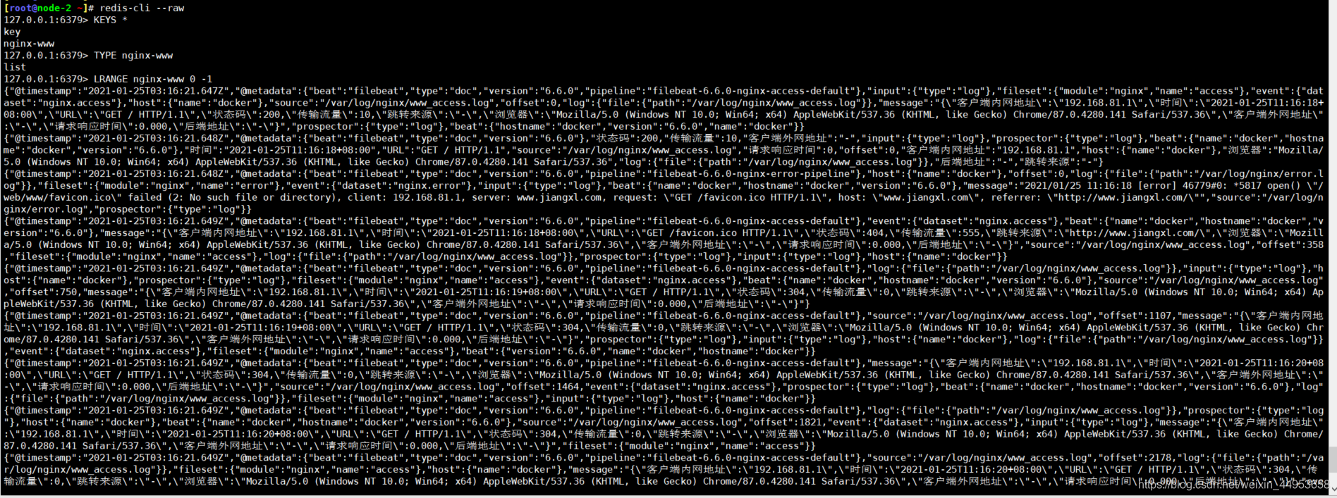 [root@node-2 ~]# redis-cli --raw 127.0.0.1:6379> KEYS * 1) "key" 2) "nginx-www" 127.0.0.1:6379> TYPE nginx-www list 127.0.0.1:6379> LRANGE nginx-www 0 -1