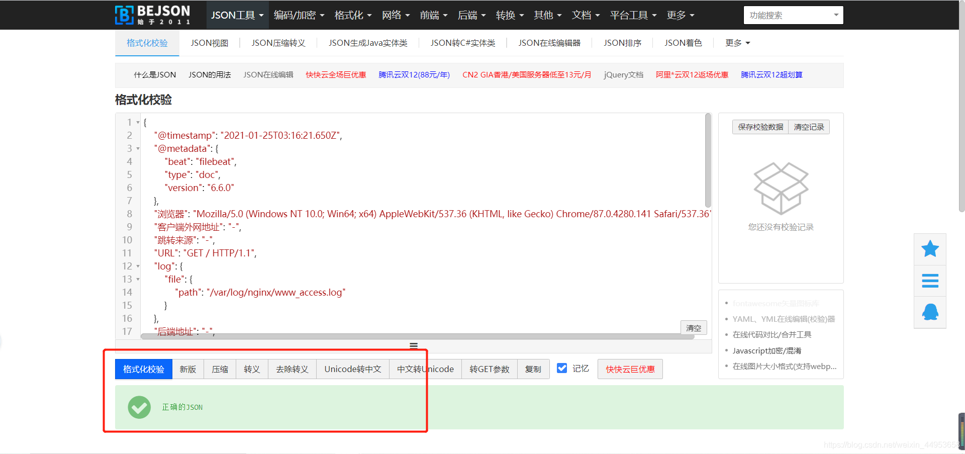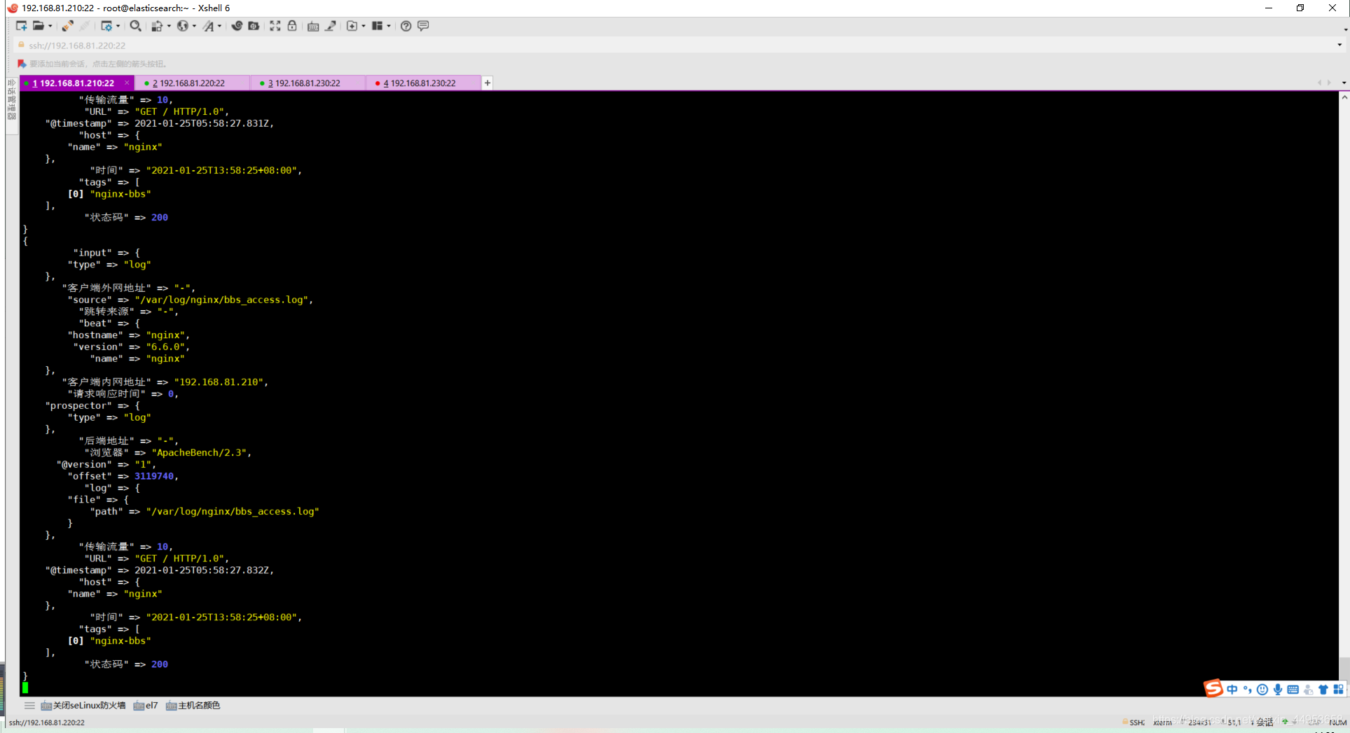 收集前要确保nginx应用的日志输出为json格式,在使用ab命令生成日志