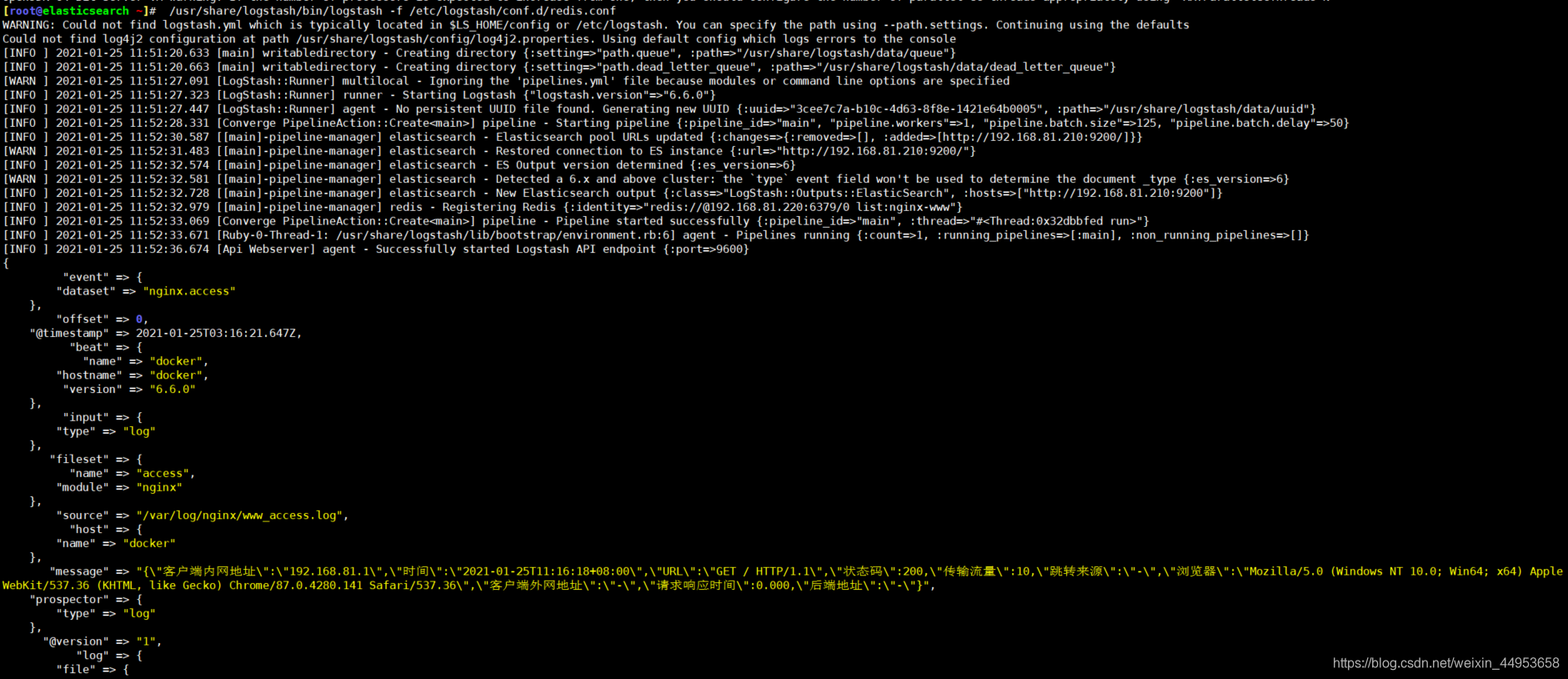 1.配置logstash [root@elasticsearch ~]# vim /etc/logstash/conf.d/redis.conf input { redis { host => "192.168.81.220" port => "6379" db => "0" key => "nginx-www" data_type => "list" } } output { stdout{} elasticsearch { hosts => "http://192.168.81.210:9200" manage_template => false index => "nginx-www-access-%{+yyyy.MM.dd}" } } 2.启动logstash [root@elasticsearch ~]# /usr/share/logstash/bin/logstash -f /etc/logstash/conf.d/redis.conf