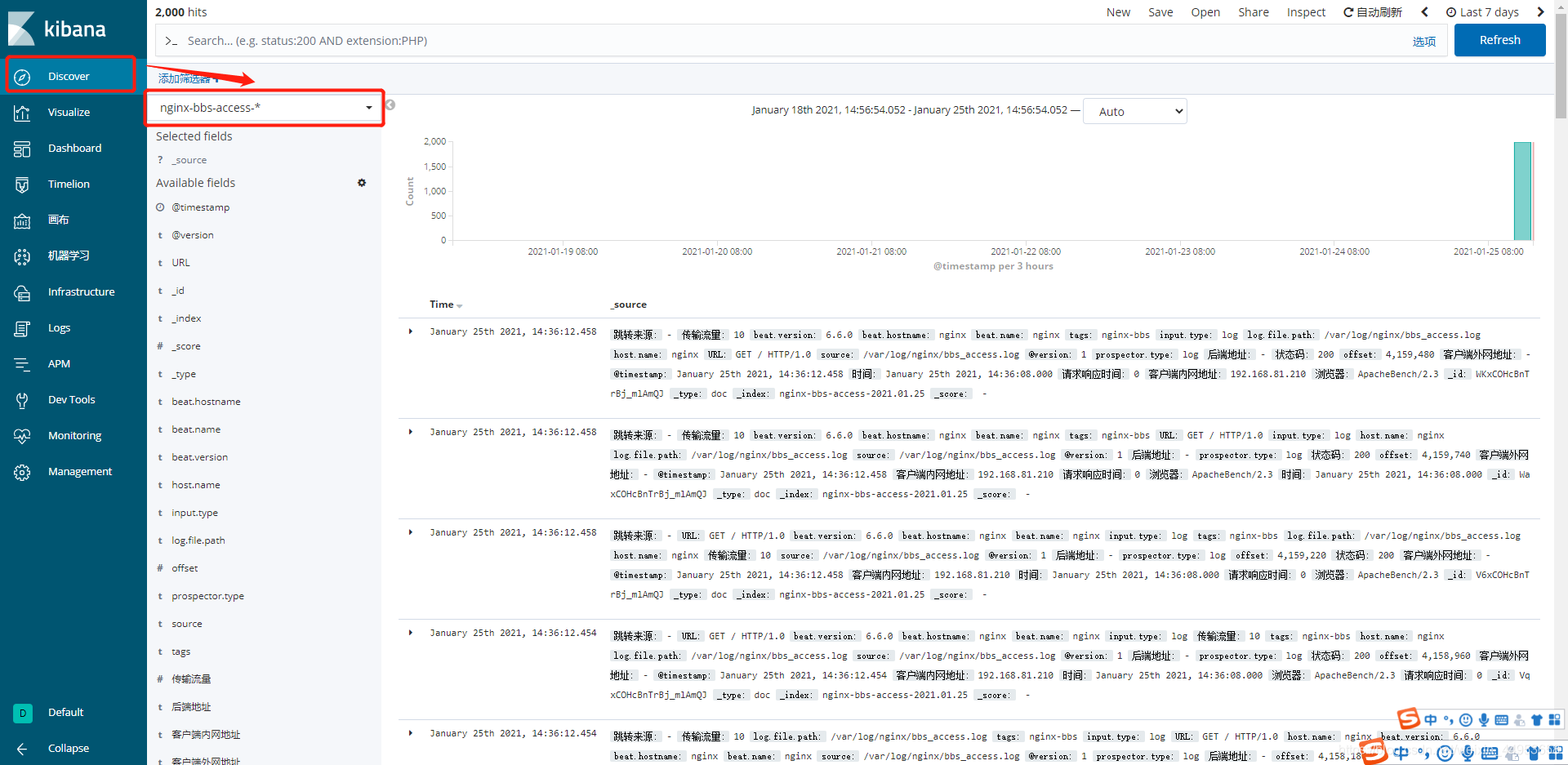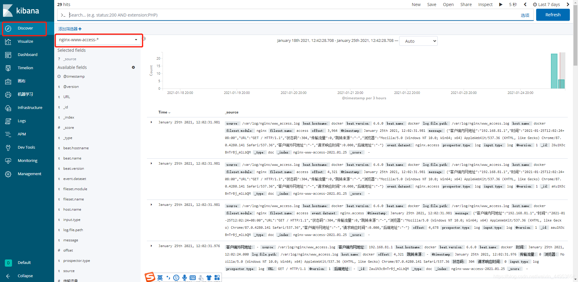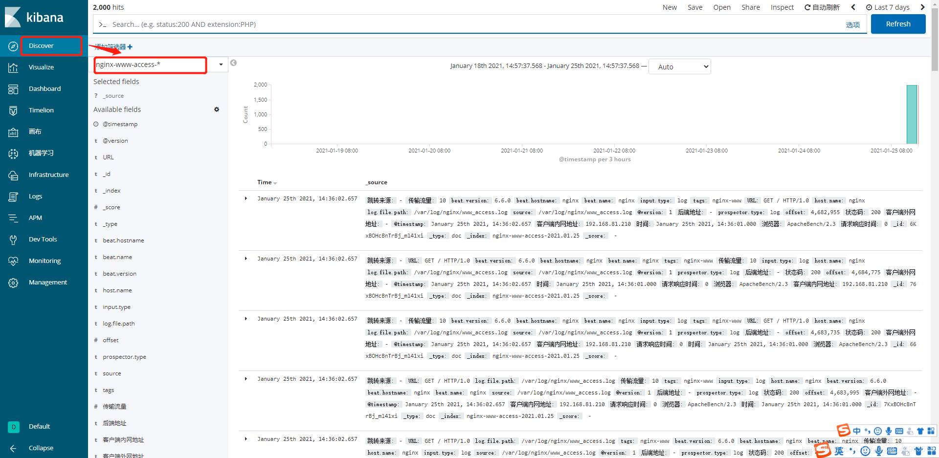已经有nginx-www key了,并且数据也都是刚刚filebeat传输过来的nginx 日志